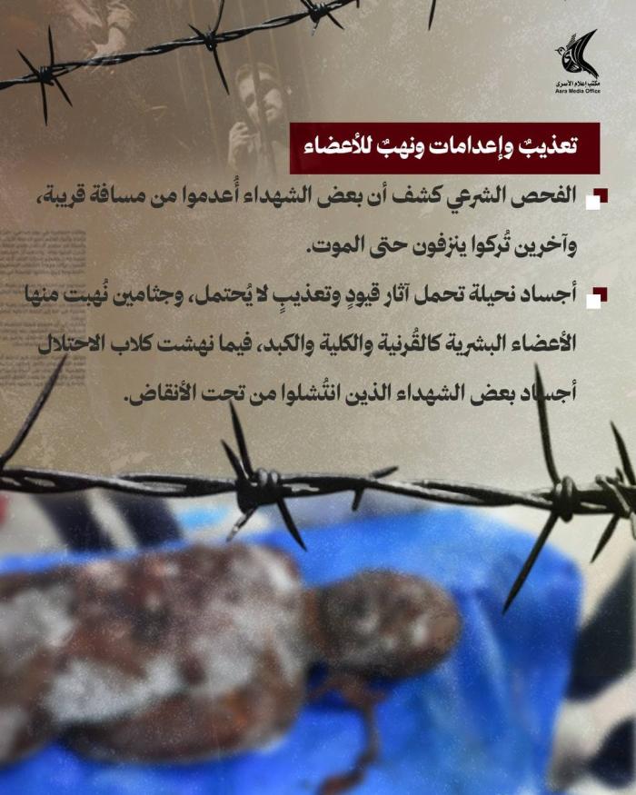 منذ 23 دقيقة المحرر المقدسي أيمن سدر: استهداف أسرى غزة: ربط بالحديد لأشهر، عُري، إرهاق، بتر أطراف بسبب التعذيب، ومحاولات تصفية جسدية ومعنوية تحت غطاء "الانتقام من غزة".