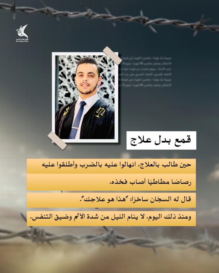 منذ 14 دقيقة المحرر المقدسي أيمن سدر: الحرمان من مقومات الحياة: انقطاع الماء والحمامات، نقص البطانيات والملابس الشتوية، منع مواد التنظيف، ومصادرة وسائل الإعلام والاتصال، وأسرى أبقوا مقيّدين تحت المطر طوال الليل، عزلة تامة ومقصودة عن العالم الخارجي.