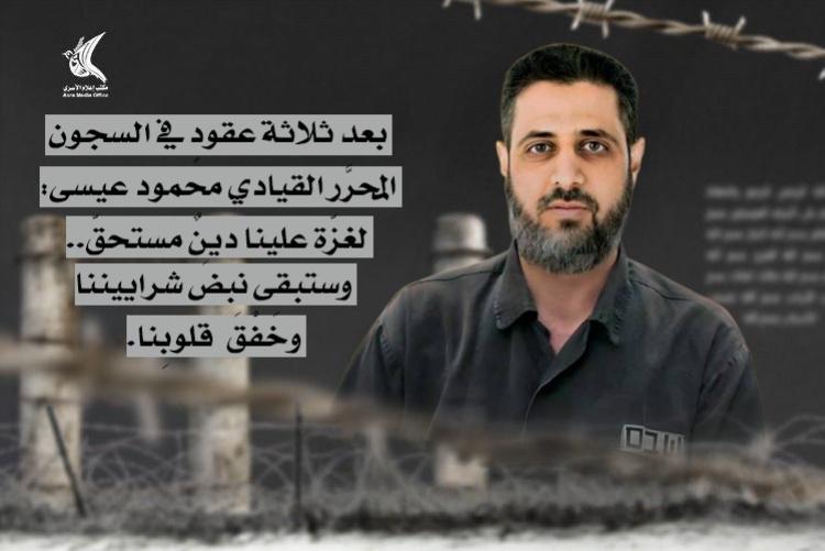هزم القائدُ الفذ محمود عيسى سنواتِ السجن الطويلة، وتبدّدت وعودُ الشاباك بأنّه "لن يرى الحرية"، فإذا به اليوم يقف شامخًا حرًّا، يُطلّ على وطنه بعينٍ تدينُ لأهل غزّة بكلّ ذرةِ هواءٍ تمرُّ في جسده.